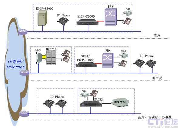 在省局我們采用EICP-S2000或EICP-C1000作為整個(gè)系統(tǒng)的核心服務(wù)器/控制器,并可與原有PBX對接;在地市局有PBX的地方采用C1000、SEG1或EEG設(shè)備,或用IP話機(jī)直接放號(hào);在縣局、營業(yè)廳、辦事處沒有PBX的地方采用SAG32/SAG8提供模擬用戶接入,或直接采用IP話機(jī)。