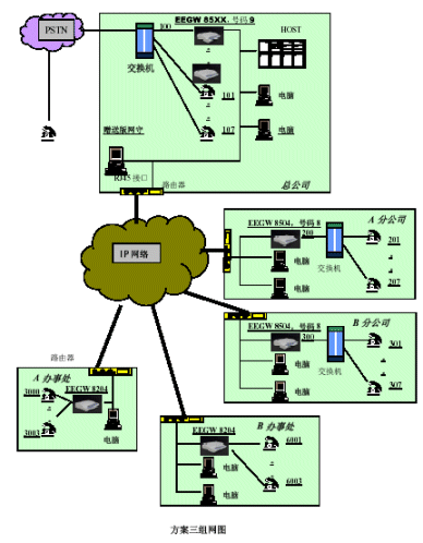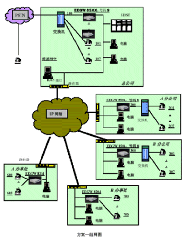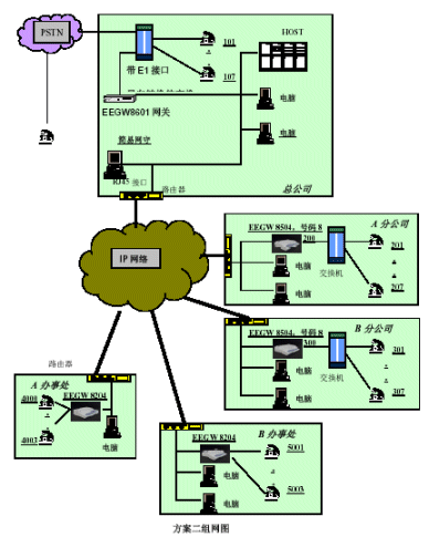 。。本方案有主要配置:總公司配備3臺EEGW8504FXO網(wǎng)關、四個分公司分別配備1臺EEGW8504FXO網(wǎng)關,四個辦事處分別配備1臺EEGW8204FXO網(wǎng)關。在總公司出可以安裝EEGK8001簡易網(wǎng)閘。