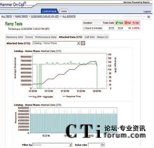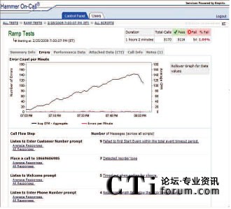 Hammer On-Call IVR測試使用各種各樣的主叫場景模擬真實世界用戶交互。通過改變呼叫量和呼叫場景的混合,Empirix測試專家可以生成指向IVR的模擬真實世界的呼叫流量。此外,在測試中,不同的呼叫測試點上可以使用不同的呼叫率。在測試過程中經(jīng)常會用到三種基本呼叫模型及其變體;緶y試是使用一個恒定的低呼叫率檢驗被測環(huán)境是否已準(zhǔn)備好接受呼叫;增量測試是使用一個固定增量穩(wěn)步增加呼叫量一直到達峰值呼叫量,然后,增加呼叫量直至超過期望值,檢驗系統(tǒng)在峰值時段內(nèi)是否有額外容量;最后,‘浸透’測試是在指定的時段內(nèi)使用一個恒定的高呼叫率檢驗系統(tǒng)穩(wěn)定性。
