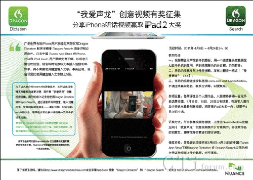 為了讓大家分享Nuance的語音技術如何改變我們的生活,讓生活變得更寫意和溝通更方便,Nuance 公司發(fā)起了“我愛聲龍”創(chuàng)意視頻征集活動。用手機或DV記錄下你使用Dragon Dictation 或Dragon Search,進行語音聽寫和搜索,輸入創(chuàng)意內(nèi)容、發(fā)現(xiàn)創(chuàng)新使用方法……題材不限,時長30秒—2分鐘以內(nèi)。每周選出五位參加者獲贈一百元手機話費充值。