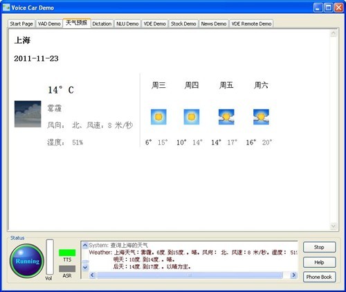 比方說這個(gè)關(guān)于空調(diào)問題,我們過去,空調(diào)的命令詞是“把空調(diào)打開,空調(diào)溫度提高3度!爆F(xiàn)在我也可以這樣說,空調(diào)調(diào)高一點(diǎn),我有點(diǎn)冷,也可以。就是你在車?yán)镞呁耆梢杂媚阕约旱恼Z言來說你想干的事。比如說,前邊你不知道明天天氣會(huì)怎么樣,人一般都會(huì)想想,明天天氣如何,或者是告訴我天氣預(yù)報(bào)。但是你也可以這樣說。明天會(huì)下雨嗎?也可以這樣說。或者你這樣說,你說,今天大盤怎么樣。完全是用自然語言來說。堵不堵車,“查詢交通情況!边@就是,實(shí)際上可以有各種不同的說法來完成這個(gè)任務(wù),這是我們自然語言的一個(gè)演示。