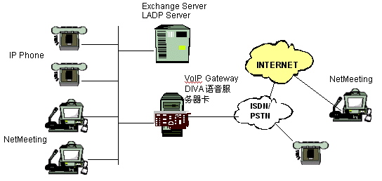 用于進(jìn)行地址解析的Exchange服務(wù)器同樣也可以進(jìn)行語音郵件的轉(zhuǎn)發(fā)。當(dāng)任何終端沒有回答呼入呼叫時(shí)DIVA VoIP 網(wǎng)關(guān)服務(wù)器可以播放一段問候語然后錄下你的留言。被錄下的語