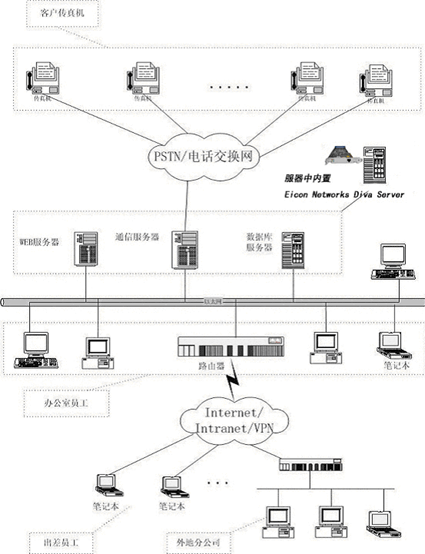 本系統(tǒng)采用最新的J2EE WEB技術,在組成結(jié)構(gòu)上主要由以下三大模塊組成:1)WEB服務器: 完成用戶通過IE瀏覽器接入訪問, 傳真發(fā)送及接收的操作界面,傳真結(jié)果的查詢,客戶地址本的維護等工作;2)傳真發(fā)送/接收通信服務器:主要完成驅(qū)動傳真板卡,通過通信線路收發(fā)傳真,檢測通信線路、對方狀態(tài),發(fā)送接收隊列管理等工作;3)數(shù)據(jù)庫服務器:主要負責用戶信息,用戶地址本信息,傳真記錄等信息存儲工作。