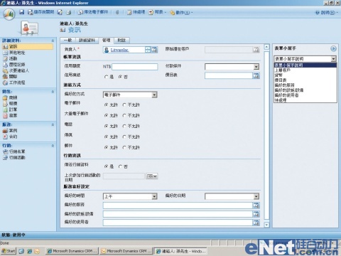 在Outlook中,這套CRM能夠追蹤聯(lián)絡(luò)人的消息、工作進(jìn)度或信件,它也具備離線功能,方便業(yè)務(wù)人員外出時(shí)使用。此外,它也結(jié)合了SQL Server的報(bào)表服務(wù),制作與檢視報(bào)表上更加方便。工作流程也可自行新增、自訂,讓所有使用者依循制定的流程來(lái)工作。不過使用上最為明顯的,還是Dynamics CRM 4.0正式新增了正體中文語(yǔ)言套件,使用者操作系統(tǒng)時(shí)不必再為語(yǔ)言不通所困擾。