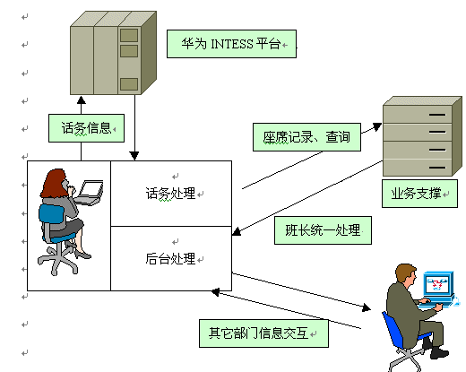 該系統(tǒng)在鐵通CRIS 平臺(tái)上運(yùn)行,前端接入采用華為CC08-A型排隊(duì)機(jī),華為INTESS平臺(tái),集成正邦高科座席軟件。完成企業(yè)業(yè)務(wù)咨詢、投訴建議的受理、產(chǎn)品訂購(gòu)、外呼調(diào)查等業(yè)務(wù),并針對(duì)各業(yè)務(wù)的特色規(guī)劃了企業(yè)的業(yè)務(wù)流程。正邦高科客戶服務(wù)系統(tǒng)的坐席軟件,和華為INTESS采用緊耦合方式將話務(wù)信息和業(yè)務(wù)信息結(jié)合在一起,便于統(tǒng)計(jì)分析,制訂客戶服務(wù)中心的運(yùn)營(yíng)策略。在后臺(tái)業(yè)務(wù)管理系統(tǒng)中,客戶服務(wù)系統(tǒng)設(shè)計(jì)了便于分析業(yè)務(wù)的一系列統(tǒng)計(jì)報(bào)表,使企業(yè)可以方便地對(duì)銷(xiāo)售過(guò)程進(jìn)行跟蹤和定單派發(fā)。