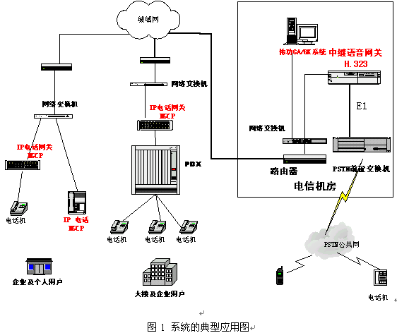 系統(tǒng)的真正價(jià)值應(yīng)該在實(shí)際應(yīng)用中得以體現(xiàn)。這套系統(tǒng)的很重要的一個(gè)應(yīng)用領(lǐng)域就是VoIP接入網(wǎng)的建設(shè)。其典型的應(yīng)用如圖1所示。