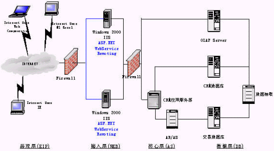 展現(xiàn)層實(shí)現(xiàn)定制化的、支持各種接入設(shè)備的統(tǒng)一消息平臺(tái)是非常必要的,它必將極大地促進(jìn)公司服務(wù)產(chǎn)品的發(fā)展。在展現(xiàn)層我們還強(qiáng)調(diào)企業(yè)信息門戶的建立:信息不是孤立的,需要一個(gè)統(tǒng)一的、互動(dòng)的、個(gè)性化的、全面的綜合表現(xiàn)形式,以更方便公司人員對(duì)信息的獲取,作出正確的決策。使用ASP.Net和OfficeXP Web Components OLAP展示工具,并能有機(jī)的與辦公自動(dòng)化工具結(jié)合起來(lái)。
