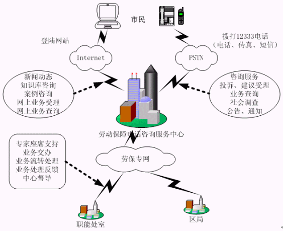 合肥市12333電話咨詢服務系統(tǒng)的建設,使勞動和社會保障業(yè)務延伸到市民、企業(yè)的身邊?朔赜蚝蜁r間的限制,實現(xiàn)了每天24小時不間斷地隨時提供服務。該系統(tǒng)的建設將原本分散在各部門的對外服務業(yè)務內容,集中在一個統(tǒng)一的對外服務"窗口",并與就業(yè)、失業(yè)、養(yǎng)老、醫(yī)療、生育及勞動關系等管理系統(tǒng)建立接口,實現(xiàn)資源共享,為勞動者提供包括電話、傳真、電子郵件、因特網(wǎng)等多種方式熱線咨詢服務,從而架起勞動者與勞動部門之間密切聯(lián)系的橋梁,使廣大勞動群眾的權益真正落到了實處。樹立勞動和社會保障行業(yè)系統(tǒng)的良好服務形象。推動勞動保障局管理和服務的社會化,實行全面的標準化、規(guī)范化、制度化和網(wǎng)絡化的完善的服務。