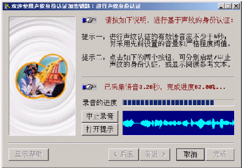 在彈出的窗口中輸入用戶名并點(diǎn)擊"語(yǔ)音身份認(rèn)證"按鈕,從彈出窗口中點(diǎn)擊"聲紋認(rèn)證"按鈕,根據(jù)系統(tǒng)提示,對(duì)著麥克風(fēng)說出含有4秒以上有效語(yǔ)音的任意一段話,讓系統(tǒng)進(jìn)行聲紋身份認(rèn)證。如果被拒絕,系統(tǒng)會(huì)顯示一個(gè)對(duì)話框,提示用戶選擇是繼續(xù)嘗試,還是放棄;如果通過,則系統(tǒng)會(huì)自動(dòng)打開用戶的私有加密文件目錄。