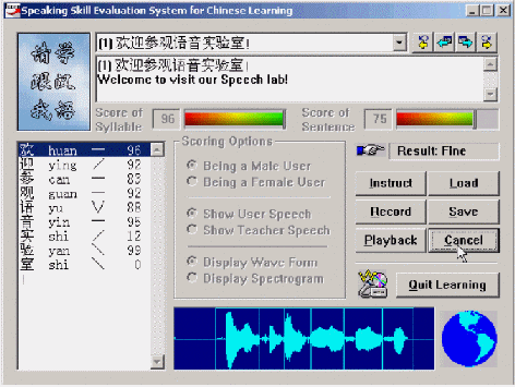 "得意"口語(yǔ)學(xué)習(xí)系統(tǒng)的原理是基于語(yǔ)音音素及其他參數(shù)的提取與分割,將使用者的語(yǔ)音音素系列與標(biāo)準(zhǔn)模型的語(yǔ)音音素序列進(jìn)行自動(dòng)比對(duì),并將比對(duì)結(jié)果通過(guò)視圖形象而直觀地給出,從而對(duì)學(xué)習(xí)者的語(yǔ)音給出恰當(dāng)?shù)脑u(píng)價(jià)(比如對(duì)每個(gè)音素給出一個(gè)得分等),以幫助其改進(jìn)和提高口語(yǔ)發(fā)音,使其接近或達(dá)到語(yǔ)音的標(biāo)準(zhǔn)水平。由于利用可視化的朗讀評(píng)分等人機(jī)交互的方式,而且通過(guò)視覺、聽覺等綜合手段,反復(fù)提示和幫助用戶接近標(biāo)準(zhǔn)發(fā)音,因而顯著提高了學(xué)習(xí)者的學(xué)習(xí)興趣,這對(duì)提高英語(yǔ)學(xué)習(xí)成績(jī)有很多幫助。