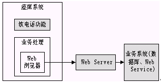 從上圖可以看出,座席端所有的業(yè)務(wù)處理都是在Web瀏覽器上進行的,所以無論是利用原有系統(tǒng)還是新開發(fā)系統(tǒng),用戶都不必要關(guān)心座席的具體實現(xiàn)方式,要做的僅僅是編寫新的JSP,ASP等可訪問后臺業(yè)務(wù)的Web頁面,然后進行簡單的配置就可以完成業(yè)務(wù)的擴充功能。