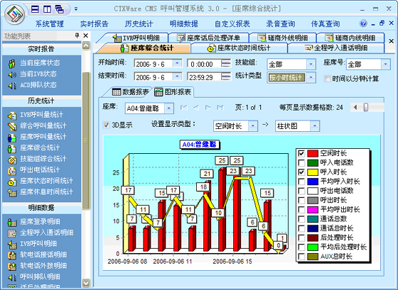 線路來話統(tǒng)計表:(分日期、時間段),包括每條線路的來話量統(tǒng)計。來話量的時間分布曲線。線路空閑情況統(tǒng)計。