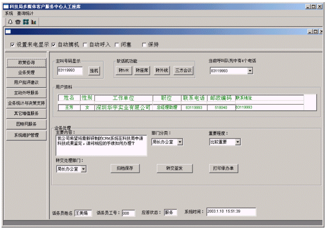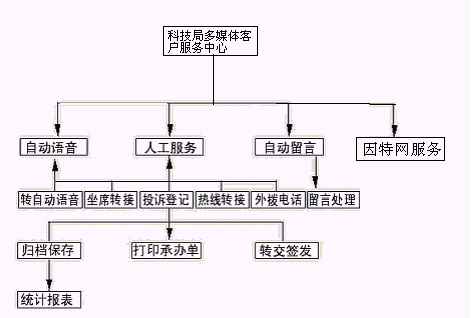 企業(yè)或個人打入電話后,可以選擇人工服務,同座席話務人員直接溝通,由話務人員將企業(yè)或個人反映的問題和提出的建議意見記錄下來,并同時記錄下該客戶的聯(lián)系方式,將相關數(shù)據(jù)添加入系統(tǒng)數(shù)據(jù)庫;也可以在數(shù)據(jù)庫的支持下回答企業(yè)或個人對科技成果和政策法規(guī)的咨詢和疑問。企業(yè)或個人也可以選擇自動語音服務方式,根據(jù)系統(tǒng)的語音提示輸入按鍵,選擇類別,將自己的投訴和建議以及自己的聯(lián)系方式信息以留言錄音的方式保存在系統(tǒng)中。系統(tǒng)同時還支持自動傳真方式,企業(yè)或個人可以通過傳真機打通客戶服務中心,通過按鍵選擇傳真方式,將自己的意見建議等的文本內容傳真給系統(tǒng),系統(tǒng)自動接受并存入數(shù)據(jù)庫。