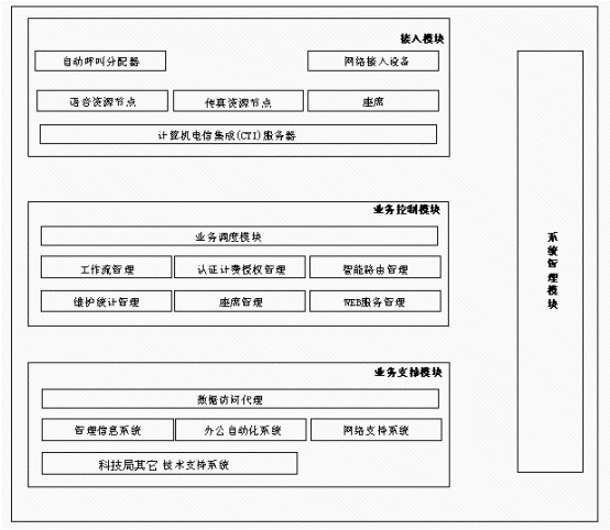 業(yè)務控制模塊包括智能路由分配、認證授權與計費管理、業(yè)務流程控制、WEB服務、座席管理、工作流服務以及維護統(tǒng)計等子模塊。