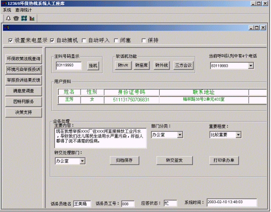 該系統(tǒng)利用環(huán)保局現(xiàn)有的信息網(wǎng)絡(luò)資源,將自動(dòng)語(yǔ)音查詢、人工服務(wù)、信息資料處理緊密結(jié)合起來(lái),為人民群眾提供全天候24小時(shí)不間斷的優(yōu)質(zhì)服務(wù)。