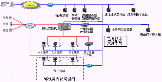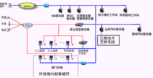 該12369環(huán)保熱線系統(tǒng)主要是由具有排隊(duì)功能的交換機(jī)或帶語(yǔ)音板卡的工控機(jī)、CTI服務(wù)器、IVR(交互式語(yǔ)音應(yīng)答)/IFR(交互式傳真應(yīng)答)子系統(tǒng)、人工座席子系統(tǒng)、應(yīng)用服務(wù)器、數(shù)據(jù)庫(kù)服務(wù)器、業(yè)務(wù)網(wǎng)關(guān)子系統(tǒng)、通信網(wǎng)關(guān)子系統(tǒng)等硬件設(shè)備和應(yīng)用軟件組成。
