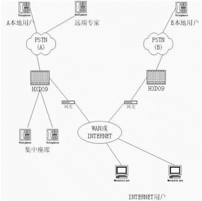 通過HXD09智能型可編程交換機(jī)構(gòu)建分布式呼叫中心(一個主呼叫中心,多個分呼叫中心),IPV 實(shí)現(xiàn)語音的遠(yuǎn)程傳輸;實(shí)現(xiàn)遠(yuǎn)程專家咨詢、集中管理座席的功能,其方式如下圖所示: