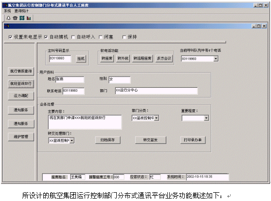 航空集團(tuán)運(yùn)行控制部門分布式通訊平臺系統(tǒng)的軟件設(shè)計(jì)采用業(yè)界先進(jìn)的三層CLIENT/SERVER體系結(jié)構(gòu),集目前先進(jìn)的計(jì)算機(jī)技術(shù)、通信技術(shù)、計(jì)算機(jī)電信集成(CTI)技術(shù)、呼叫接入技術(shù)、智能接入交換分配技術(shù)、數(shù)字語音處理技術(shù)、異構(gòu)系統(tǒng)信息交互技術(shù)、安全容錯技術(shù)、網(wǎng)絡(luò)組網(wǎng)技術(shù)等于一體,并與航空集團(tuán)運(yùn)行控制部門已有技術(shù)支持系統(tǒng)(如飛行運(yùn)行控制系統(tǒng)、航路計(jì)劃系統(tǒng))緊密結(jié)合在一起,突破時空的限制,通過人工座席、自動語音/傳真、相關(guān)部門工作人員等為集團(tuán)內(nèi)部提供電話、傳真服務(wù)形式的周到、快捷、全方位的通信服務(wù)。