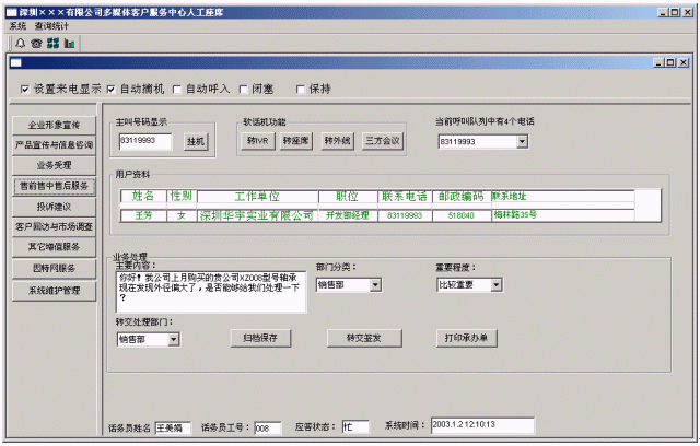 (2)提高家電企業(yè)親切感:系統(tǒng)在人工服務狀態(tài)下,當業(yè)務代表輸入客戶名稱時,系統(tǒng)即時將客戶與家電企業(yè)相關的信息顯示在座席終端上,使業(yè)務及時了解客戶,有針對性回答客戶問題,使客戶倍感親切。