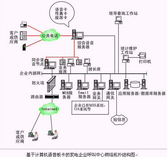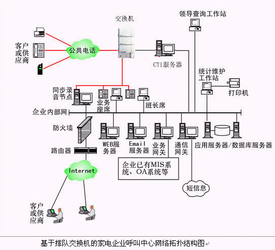 對于大中型的家電企業(yè)呼叫中心系統(tǒng),可選用排隊交換機作為語音接入設備,保障系統(tǒng)的高可靠性和穩(wěn)定性;