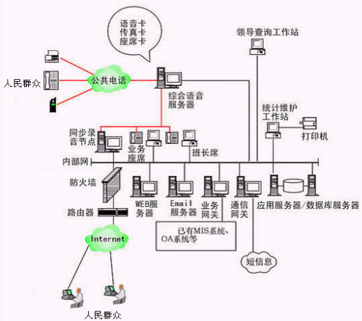 本系統(tǒng)物理結(jié)構(gòu)由排隊(duì)交換機(jī)、CTI服務(wù)器、IVR(交互式語(yǔ)音應(yīng)答)/IFR(交互式傳真應(yīng)答)服務(wù)器、業(yè)務(wù)代表座席(邏輯上分為:普通業(yè)務(wù)代表座席、專家座席、WEB座席等)、班長(zhǎng)座席、統(tǒng)計(jì)維護(hù)管理工作站、因特網(wǎng)(WEB)服務(wù)器、電子郵件(EMAIL)服務(wù)器、數(shù)據(jù)庫(kù)/應(yīng)用服務(wù)器、錄音留言工作站、領(lǐng)導(dǎo)查詢工作站、業(yè)務(wù)網(wǎng)關(guān)服務(wù)器、通信網(wǎng)關(guān)、網(wǎng)絡(luò)系統(tǒng)等和應(yīng)用軟件構(gòu)成。