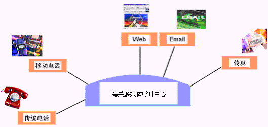 客戶利用電話、傳真、電子郵件、因特網(wǎng)、手機等撥打某一特服號碼(如9xxxx)進入海關(guān)多媒體呼叫中心系統(tǒng),本系統(tǒng)依托海關(guān)緝私相關(guān)的MIS系統(tǒng)、OA度系統(tǒng)等各類業(yè)務(wù)技術(shù)支持系統(tǒng)和網(wǎng)絡(luò)系統(tǒng),通過自動語音服務(wù)或人工受理等方式全天24小時不間斷地為客戶提供各種服務(wù)。