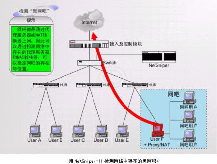 上圖中,NetSniper-II可以對網(wǎng)絡(luò)內(nèi)部各用戶進行檢測,一旦發(fā)生某個用戶安裝代理服務(wù)器軟件,其他用戶通過該用戶的接口上網(wǎng)偷逃網(wǎng)費的情況,或發(fā)現(xiàn)盜用MAC地址上網(wǎng)及通過Modem回撥上網(wǎng)的情況,NetSniper-II即可定位這些用戶,并且采取通知系統(tǒng)管理員或自動封堵非法用戶等措施。