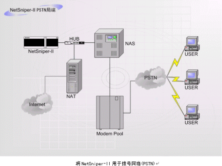 在這三個圖中,局端使用了NetSniper-II,如同在以太網(wǎng)絡(luò)的環(huán)境下一樣,NetSniper-II可以對網(wǎng)絡(luò)內(nèi)部各用戶進行檢測,一旦發(fā)生某個用戶安裝代理服務(wù)器軟件,其他用戶通過該用戶的接口上網(wǎng)偷逃網(wǎng)費的情況,或發(fā)現(xiàn)盜用MAC地址上網(wǎng)及通過Modem回撥上網(wǎng)的情況,NetSniper-II即可定位這些用戶,并且采取通知系統(tǒng)管理員或自動封堵非法用戶等措施。