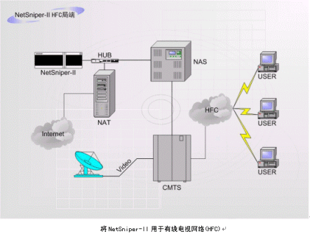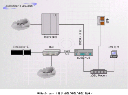NetSniper-II也可以作為局端設(shè)備,用于xDSL(ADSL/VDSL)、PSTN(電話撥號網(wǎng)絡(luò))、HFC(有線電視網(wǎng)絡(luò))等。此時,NetSniper-II能夠有效的防止控制共享上網(wǎng)、盜用MAC地址上網(wǎng)和Modem回撥上網(wǎng)的情況發(fā)生。下面兩個圖例指出了如何將NetSniper-II用于局端。