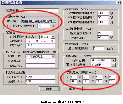 由上圖我們可以看出,NetSniper可以方便地根據(jù)用戶IP地址或MAC地址控制同一網(wǎng)口用戶數(shù)量,用戶數(shù)量控制可以分八級,包括單一用戶和無限用戶的缺省設(shè)置,一共十級。用戶數(shù)量按照按自己的意愿定義每一級用戶可以管理計算機的數(shù)量,準確,靈活,是運營商增加接入服務(wù)方式的強大基礎(chǔ)。
