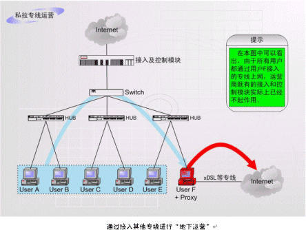 目前所知道的第一種非法運營情況:如上圖中的F用戶合法申請一根ADSL或其他線路然后在自己的計算機中安裝代理服務(wù)軟件或者連接一個路由器,就可以糾集若干住戶分攤該專線的租費,并通過該出口共享帶寬訪問外網(wǎng),而且他們同時還可以享受小區(qū)內(nèi)部網(wǎng)絡(luò)所固有的所有功能。