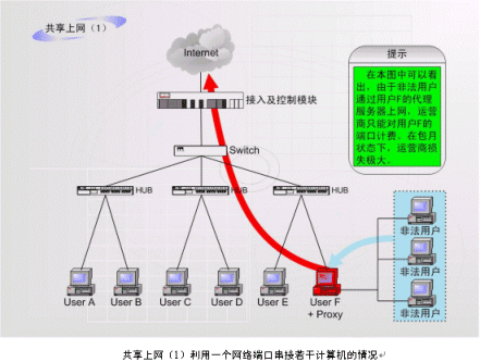 非法運營情況之二:如上圖中的F用戶作為運營商的合法包月用戶,上網(wǎng)服務(wù)開通以后,在自己的計算機中安裝代理服務(wù)軟件或者安裝路由器,這樣就可以隨時糾集若干住戶分攤包月費用,甚至私設(shè)網(wǎng)吧。