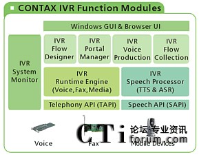 CONTAX IVR 是一個(gè)完整的媒體交換方案,可用于交互式語(yǔ)音應(yīng)答、文字/語(yǔ)音轉(zhuǎn)換、電腦電話(huà)語(yǔ)音整合、傳真轉(zhuǎn)遞、自動(dòng)傳真回覆 (FOD)、簡(jiǎn)訊發(fā)送等等……