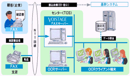 系統(tǒng)結(jié)構(gòu)中心每天收到FAX7~800張。客戶數(shù)約 1,400家。系統(tǒng)配置是有VOISTAGE(VS-403MC)功能的FAX服務(wù)器和OCR