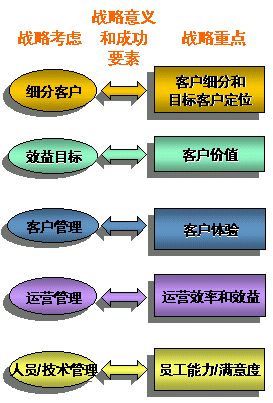 客戶關(guān)系管理戰(zhàn)略一般由以下5個部分的戰(zhàn)略考慮和相關(guān)的戰(zhàn)略重點構(gòu)成: