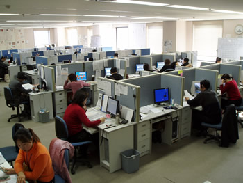當你站在這布局緊湊但井井有條、具有典型日式風格的辦公大廳里,看到這些彬彬有禮的座席代表,耳邊又不時傳來各種聲調(diào)的日語時,你會毫不懷疑地認為自己是在東京或是橫濱的某個大公司的呼叫中心里。然而,從大廈的窗外望去,遠處聳立的大連電視塔和眼前的勞動公園都提醒你:這是在中國大連的商業(yè)區(qū)中心。