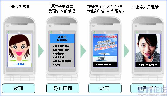 以往的IVR根據(jù)選擇項(xiàng)、層數(shù),必須多遍聽取語音內(nèi)容才能找到預(yù)期的菜單,成了一大課題。視頻呼叫中心則在FOMA的畫面上顯示服務(wù)菜單,通過選擇號(hào)碼可以簡化聽取語音的過程。而且,在連接客服人員的電話等待時(shí)間中可以播放廣告。通過靈活運(yùn)用這些功能,提高了IVR的操作性,提供了新型廣告宣傳的機(jī)會(huì)。