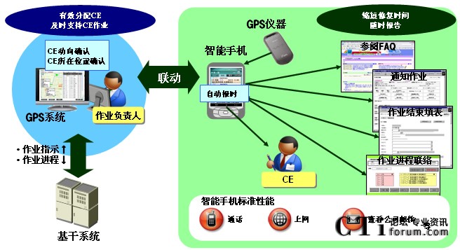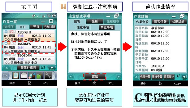 “MoBiz AP for CE支持系統(tǒng)”是在支持保修人員在工作現(xiàn)場作業(yè)的同時(shí),實(shí)現(xiàn)總部對(duì)工作現(xiàn)場“可視化”管理的應(yīng)用程序軟件包。