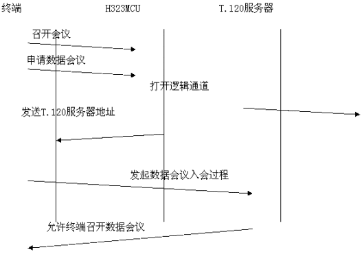 采用帶外方式,數(shù)據(jù)與音頻視頻流分開,各自占用帶寬。與終端和MCU無任何關(guān)系。如果用戶想召開數(shù)據(jù)會議,需要單獨的一臺PC機來進行數(shù)據(jù)的接受與傳送,所有需要數(shù)據(jù)會議功能的用戶的PC機都連接到一個T.120服務(wù)器上。目前常用的終端軟件是Netmeeting軟件。數(shù)據(jù)占用單獨的帶寬,不擠占音視頻的帶寬。會議建立過程為: