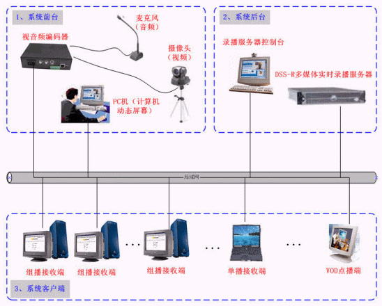 - DSS-R多媒體實時錄播服務(wù)器:為系統(tǒng)的核心,主要完成視頻、音頻、計算機(jī)動態(tài)屏幕的錄制和直播;