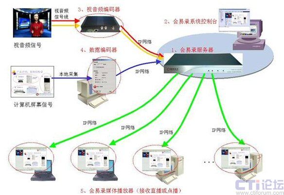 會易錄-多媒體錄播系統(tǒng)可安裝在主會場,通過視音頻編碼器接入主會場視頻會議終端輸出的遠(yuǎn)端/本地視頻及語音(VCR音頻接口)信號,根據(jù)會議進(jìn)程會議管理員對MCU的進(jìn)行切換控制,視頻會議終端上會顯示出相應(yīng)遠(yuǎn)程會場的圖像及語音,視音頻編碼器即可該信號采集編碼后發(fā)送給會易錄服務(wù)器。會易錄服務(wù)器可和MCU,T.120數(shù)據(jù)服務(wù)器等設(shè)備安裝在后臺機房或控制室。在同步錄制數(shù)據(jù)內(nèi)容時,可在發(fā)送雙流或參加T.120數(shù)據(jù)會議的PC安裝數(shù)據(jù)編碼器軟件采集計算機屏幕內(nèi)容,會議管理員只要通過會易錄系統(tǒng)控制臺連接上視音頻編碼器和數(shù)據(jù)編碼器后啟動錄制功能即可,會議進(jìn)行中無需再進(jìn)行任何操作。會易錄以與會場切換相同的視角,“所見所錄”的模式對視頻會議進(jìn)程進(jìn)行忠實、全面的記錄,實用性強,操作維護(hù)簡單,極大地降低了會議管理員的工作負(fù)擔(dān)。