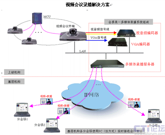 如圖所示,上級機(jī)構(gòu)視音頻編碼器接在視音頻源上,對視音頻信號采集,VGA編碼器采集VGA信號,通過網(wǎng)絡(luò)傳給放在機(jī)房的多媒體錄播服務(wù)器;鶎訖C(jī)構(gòu)的各個分會場通過IE瀏覽器的方式接受會議直播。