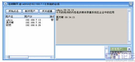 系統(tǒng)增加了多方文字互動聊天功能,在線聊天功能可以選擇給所有人員發(fā)送消息,也可以選擇給某一特定人員發(fā)送。這樣在會議或培訓(xùn)的過程中,管理員可以選擇性的提出相應(yīng)的問題給相關(guān)人員,考核相關(guān)人員的培訓(xùn)效果;其他人員也可以將會議或培訓(xùn)過程中遇到的疑問、難點(diǎn)及時的反應(yīng)給管理員進(jìn)行解答,增強(qiáng)會議的成效。