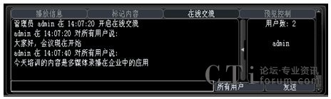 系統(tǒng)增加了多方文字互動(dòng)交流功能,在線交流功能可以選擇給所有人員發(fā)送消息,也可以選擇給某一特定人員發(fā)送。這樣在會(huì)議或培訓(xùn)的過程中,管理員可以選擇性的提出相應(yīng)的問題給相關(guān)人員,考核相關(guān)人員的培訓(xùn)效果;其他人員也可以將會(huì)議或培訓(xùn)過程中遇到的疑問、難點(diǎn)及時(shí)的反應(yīng)給管理員進(jìn)行解答,增強(qiáng)會(huì)議或培訓(xùn)的成效。