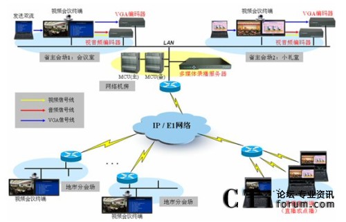 項目中采用了一套銳。ǚ植际剑┒嗝襟w錄播系統(tǒng),其中多媒體錄播服務(wù)器一臺,部署在網(wǎng)絡(luò)機房;兩套編碼器分別部署在會議室和小禮堂,編碼器從視頻會議終端獲取視音頻及雙流信號,并通過IP網(wǎng)絡(luò)發(fā)送給機房內(nèi)多媒體錄播服務(wù)器,由多媒體錄播服務(wù)器實現(xiàn)視頻會議的錄制、直播和點播,該服務(wù)器支持2組會議并發(fā)錄播,可滿足2組并發(fā)視頻會議的錄播需要。分會場及不具備視頻會議終端的地方,可使用電腦登陸多媒體錄播服務(wù)器來接收會議的實時直播或在會后進行點播。