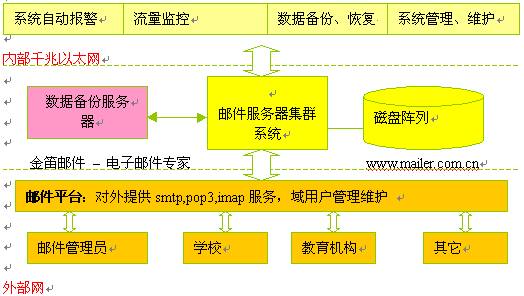 本方案是根據(jù)沈陽教育信息中心對(duì)電子郵件系統(tǒng)大容量、高擴(kuò)展性、分級(jí)管理的實(shí)際要求,結(jié)合金笛郵件集群系統(tǒng)的技術(shù)特點(diǎn),本著高速穩(wěn)定、易于管理、易于維護(hù)、適度超前的原則,可以作為實(shí)施方案的參考。