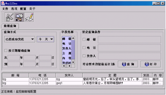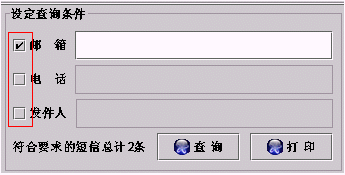 ·也可以通過給定查詢條件來查詢某項內(nèi)容,如針對某個郵箱、手機電話或發(fā)件人,方法是通過點擊左邊的小方框來選中,然后輸入相應(yīng)內(nèi)容即可,如下圖: