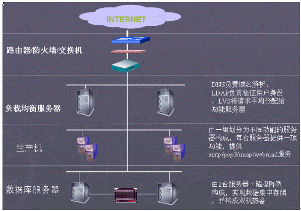 從軟件系統(tǒng)要求的分布式結(jié)構(gòu),并考慮到前期50萬郵箱的規(guī)模,為了兼顧性能和造價,建議采用高端IA架構(gòu)服務器作為硬件平臺,另一方面充分考慮系統(tǒng)軟件的高可用性結(jié)構(gòu)設計。