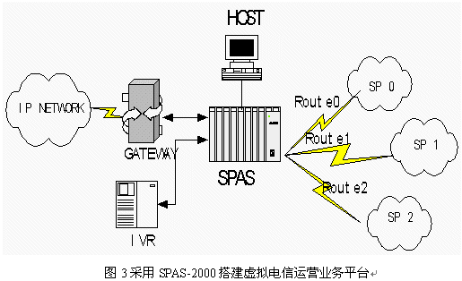 中國加入WTO后,國內(nèi)與國際的聯(lián)系、交流和溝通將會(huì)越來越頻繁,這一趨勢帶來了巨大的電信服務(wù)市場商機(jī)。同時(shí),國際電信企業(yè)正在尋求進(jìn)入中國的途徑,國內(nèi)新興的電信運(yùn)營商積極應(yīng)對這種局面,而虛擬電信運(yùn)營商也在國內(nèi)開始出現(xiàn)。如何爭取客戶是所有這些提供電信服務(wù)的企業(yè)共同面臨的課題。一個(gè)智能化的、高效的、靈活的、有特點(diǎn)并易于控制的服務(wù)平臺(tái)無疑是他們進(jìn)行競爭的重要工具。由于SPAS-2000可編程交換機(jī)是一個(gè)全開放的靈活平臺(tái),用戶通過應(yīng)用程序幾乎可以完全控制交換,能很好的滿足用戶的需求。在此SPAS-2000可編程交換機(jī)上開發(fā)的電話批發(fā)及零售業(yè)務(wù)應(yīng)用,配合計(jì)算機(jī)技術(shù),能靈活控制業(yè)務(wù)的路由選擇、費(fèi)率計(jì)算并可提供個(gè)性化服務(wù),為運(yùn)營商降低運(yùn)營成本,提高服務(wù)質(zhì)量給出了有效的解決方案。例如一個(gè)IP電話運(yùn)營商在全球互連中可能有多個(gè)合作伙伴,每個(gè)合作伙伴提供的服務(wù)也不相同,為了節(jié)省費(fèi)用并提高服務(wù)質(zhì)量,IP電話運(yùn)營商需要根據(jù)時(shí)段、費(fèi)率、通話質(zhì)量、接通率等指標(biāo)智能選擇去話路徑。SPAS-2000可編程交換機(jī)提供編程開發(fā)接口,通過E1與IVR連接,在服務(wù)器上開發(fā)高層應(yīng)用軟件,可以實(shí)現(xiàn)多種高級(jí)功能。同時(shí)SPAS還可以連接各種型號(hào)的網(wǎng)關(guān)。應(yīng)用連接圖見圖3: