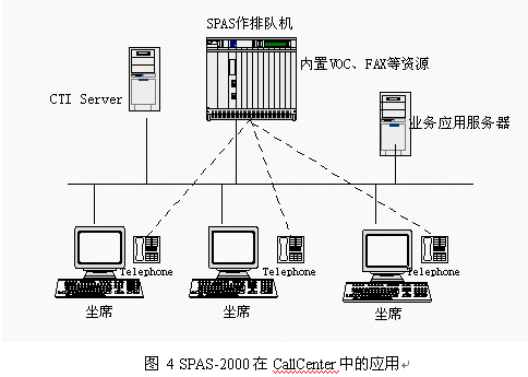 目前國內(nèi)呼叫中心的建設(shè)方興未艾,企業(yè)為了改善服務(wù),贏得客戶,紛紛建設(shè)自身的呼叫中心。如果建立呼叫中心全部采用國外設(shè)備,價(jià)格非常昂貴,使很多客戶望而卻步。這樣大的投資目前也只有電信(包括移動(dòng)和聯(lián)通)、電力、銀行等資金充裕的行業(yè)才能承受。而且,根據(jù)我方了解,即使這些行業(yè)也在控制采購成本,原先只注重名牌,不計(jì)成本的情況正在改變。而在目前宏觀經(jīng)濟(jì)形勢不景氣的大背景下,大中型企業(yè)既要加快企業(yè)信息化建設(shè),保住客戶,降低成本,又要精打細(xì)算,規(guī)避投資風(fēng)險(xiǎn)。我們掌握建立呼叫中心設(shè)備的所有核心技術(shù),因此在呼叫中心應(yīng)用方面有很大的價(jià)格優(yōu)勢,這樣就降低了擁有呼叫中心的門檻,在這個(gè)市場上也有很強(qiáng)的競爭力。采用SPAS-2000可編程交換機(jī)支持智能業(yè)務(wù)通用編程接口,可以作為CallCenter核心設(shè)備,應(yīng)用圖見圖4: